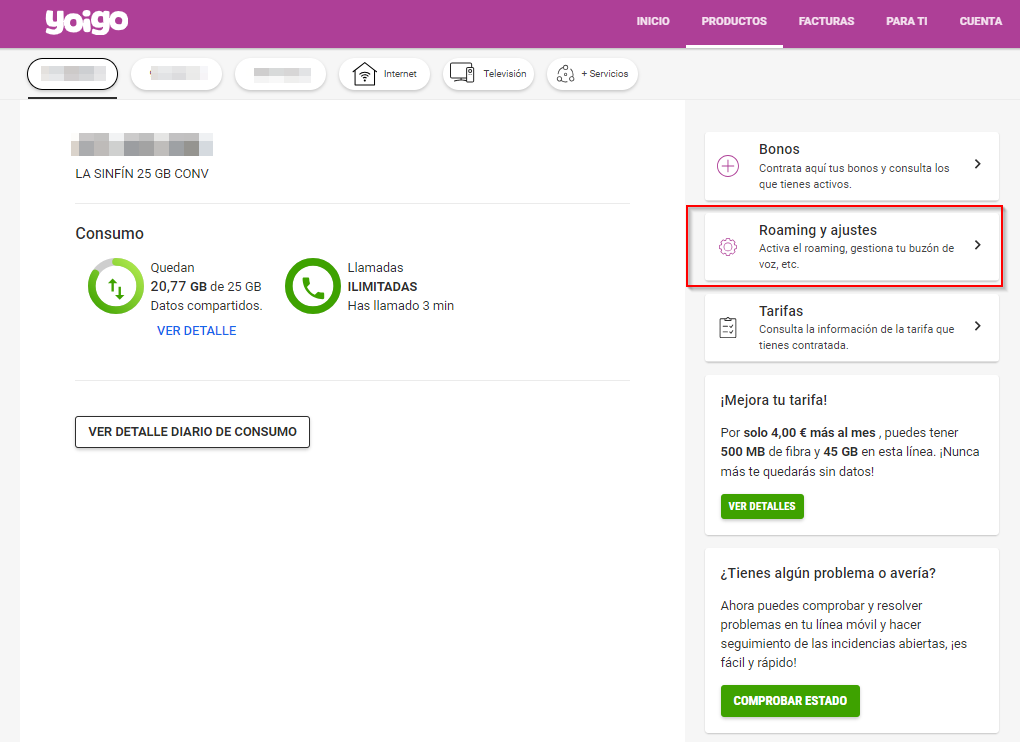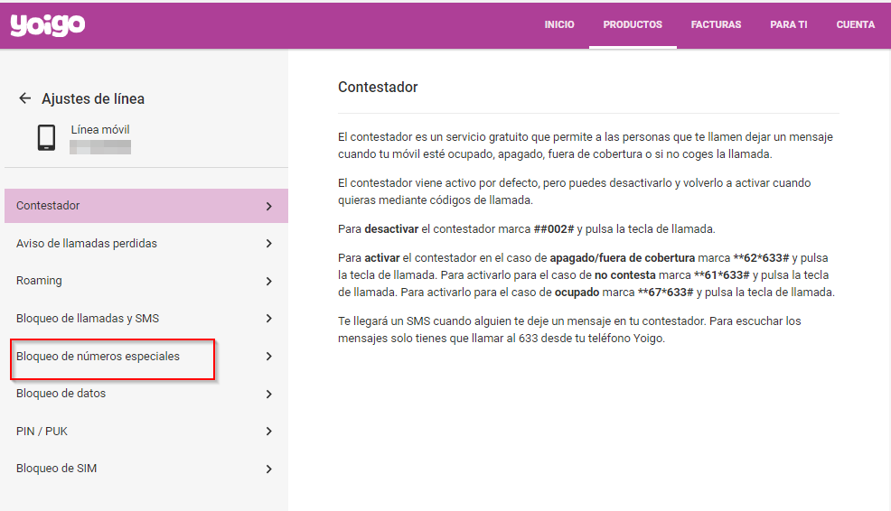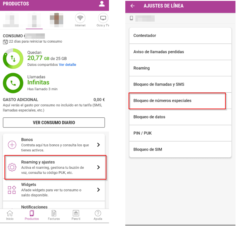 Accede a Mi Yoigo > selecciona la línea que quieres gestionar > Entra en Roaming y Ajustes > Bloqueo de números especiales